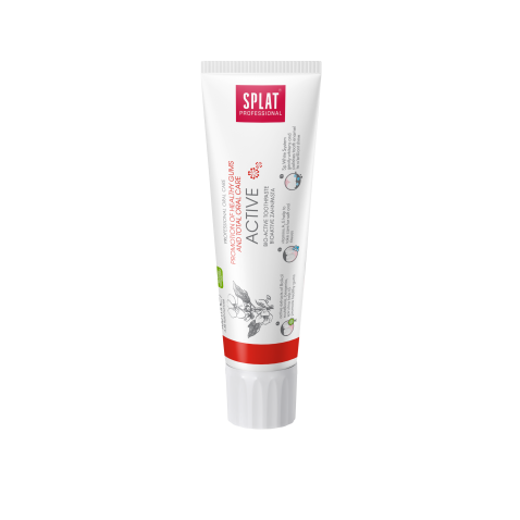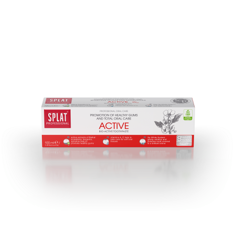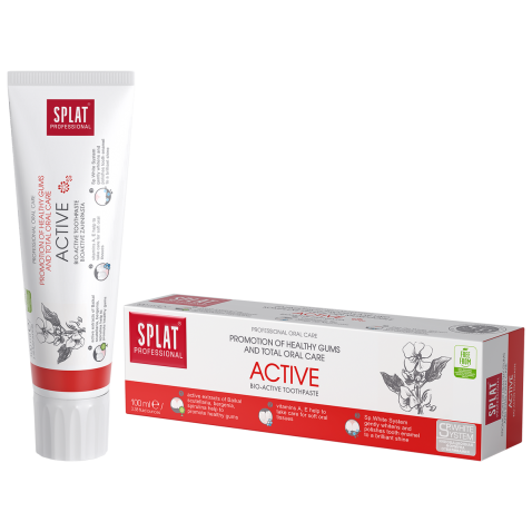 Пастата за зъби SPLAT ACTIVE съдържа екстракти от байкалски капсули, Бергения, Спирулина, които спомагат за укрепване на здравите венци. Витамините А, Е помагат за поддържане на меките устни тъкани. Калциевият глицерофосфат е един от най-ефективните източници на калциеви йони, които спомагат за укрепване на зъбния емайл и активират процеса на реминерализация. Sp.White System нежно почиства и полира зъбния емайл до сияещ блясък. Тази паста за зъби не съдържа синтетични оцветители.