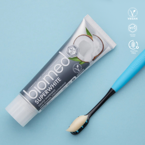 Biomed SUPERWHITE паста за зъби с естествено кокосово масло и екстракт от ананас за нежно избелване на чувствителни зъбни емайли. Здравата бяла усмивка ще бъде вашата визитка!