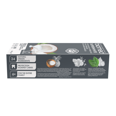 Aqua, Hydrated Silica, Hydrogenated Starch Hydrolysate, Dicalcium Phosphate Dihydrate, Glycerin, Sodium Coco-Sulfate, Cellulose Gum, Aroma, Zinc Gluconate, Benzyl Alcohol, Mentha Piperita Oil, Menthyl Lactate, Stevia Rebaudiana Leaf Extract, Tetrasodium Glutamate Diacetate, Hydroxyapatite, Arginine, Cocos Nucifera Oil, Cinnamomum Cassia Bark Extract, Decyl Glucoside, Ananas Sativus Fruit Extract, Maltodextrin, Cinnamomum Camphora Bark Oil, Thymus Serpillum Oil, Betula Alba Leaf Extract, Plantago Major Leaf Extract, Sodium Bicarbonate, Populus Tremuloides Bark Extract, Sodium Hydroxide, Helianthus Annuus Seed Oil, Sodium Benzoate, Potassium Sorbate, Limonene.