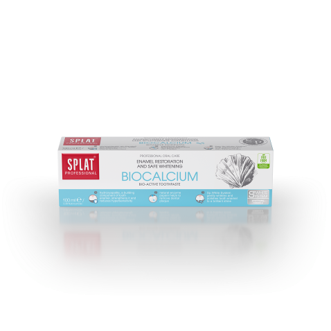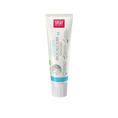 SPLAT BIOCALCIUM е цялостна паста за зъби с биоактивен калций, получен от яйчени черупки, които допринасят за реминерализация на емайла. Хидроксиапатитът, изграждащ компонент на зъбния емайл, го укрепва и намалява свръхчувствителността. Естественият ензим папаин предотвратява образуването на плака. Sp.White System нежно избелва и полира зъбния емайл до сияещ блясък.