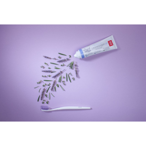 Ефективна паста за зъби за цялостна грижа с етерични масла от лавандула, розмарин и мащерка насърчава здравите венци. Естественият ензим папаин нежно избелва емайла, оставяйки го напълно чист и гладък. Калциевият фосфат намалява свръхчувствителността на зъбите.